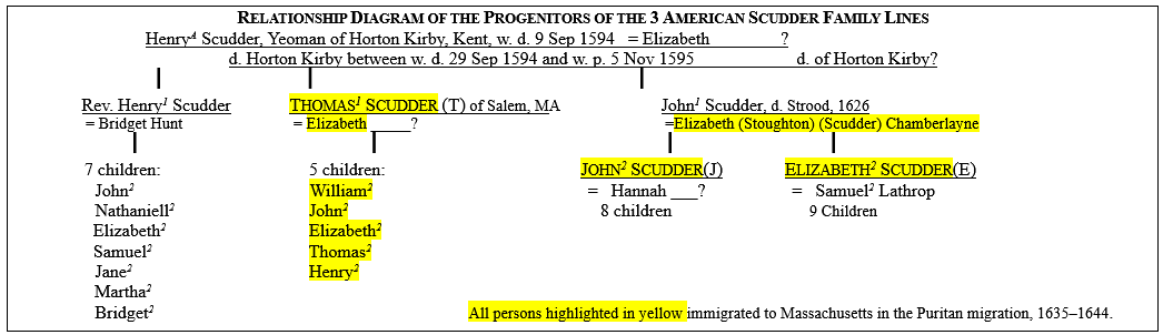 Thomas Scudder (T), John Scudder (J), Elizabeth (Scudder) (E) Lathrop and our common English ancestor Henry Scudder