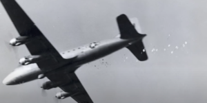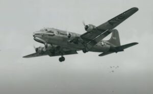 Gail Halvorsen throws chocolate and chewing gum on parachutes as the   “Candy Bomber” over Berlin in October 1948.